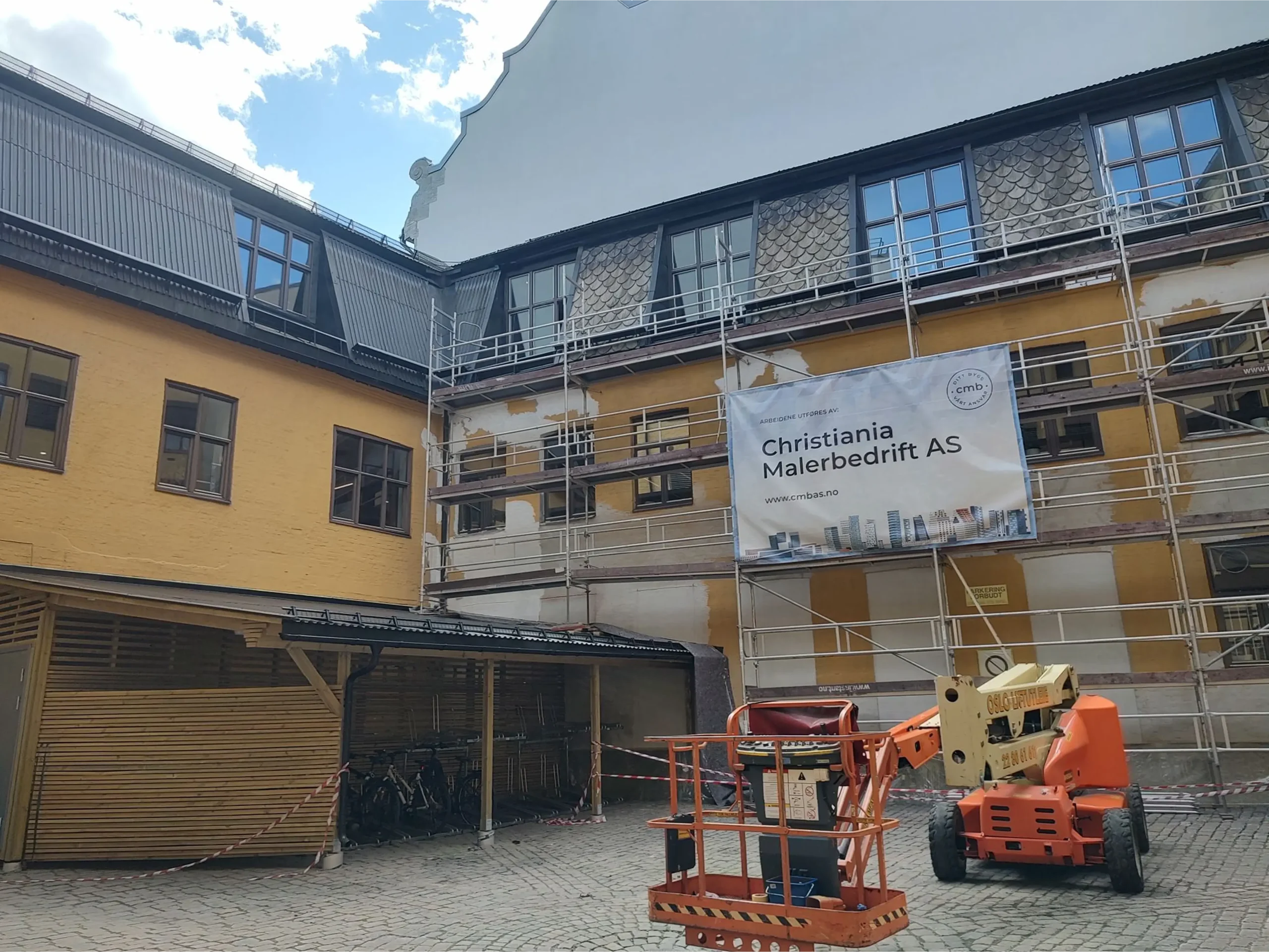 Som del av oppgraderingen av bakgården i Storgata 3 ble det gjennomført omfattende maler- og høydearbeider i 2022. Arbeidene startet i uke 22 med transport og montering av stillas. For deler av fasaden over nytt takutstikk ble det i tillegg hentet inn lift, ettersom konstruksjonen ikke egnet seg for stillas.